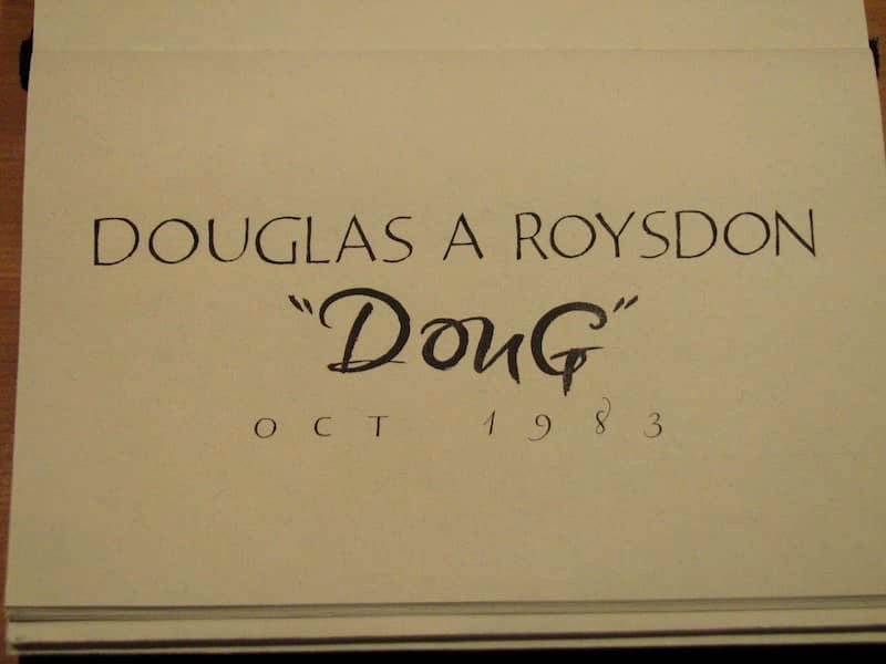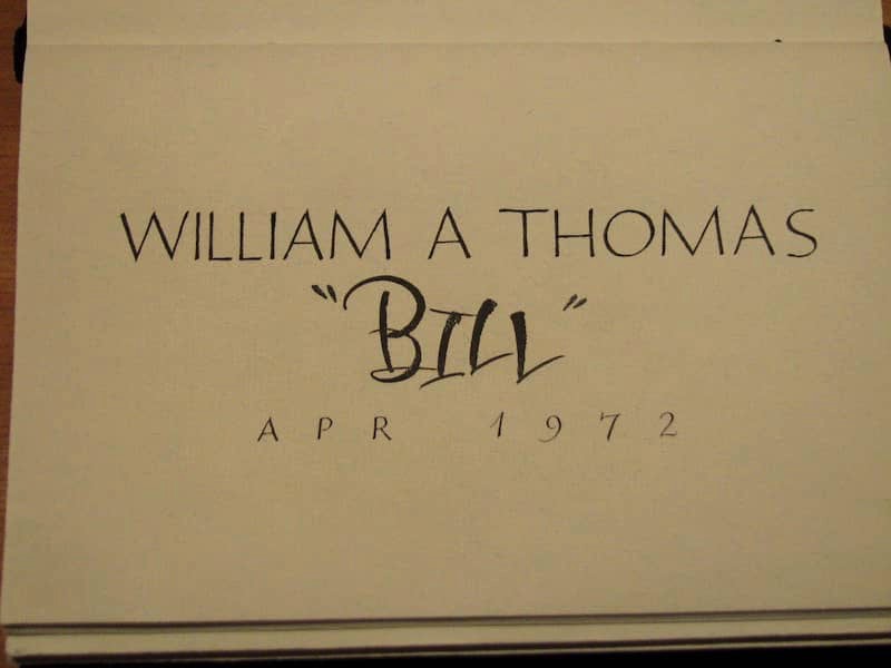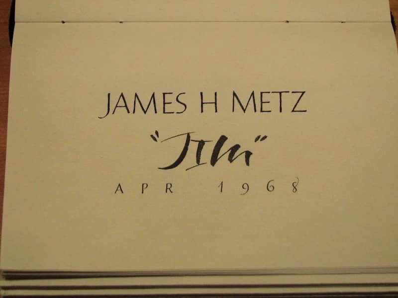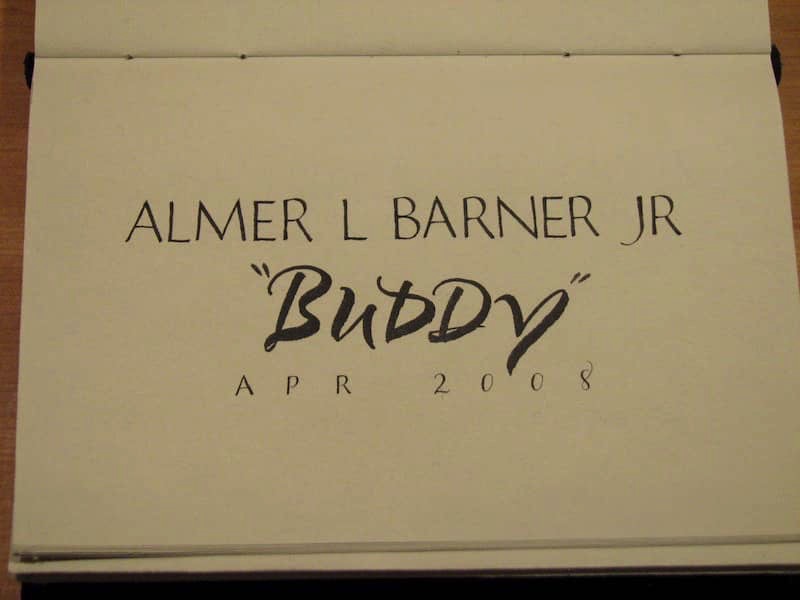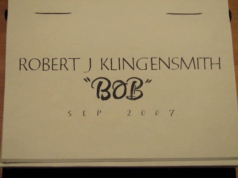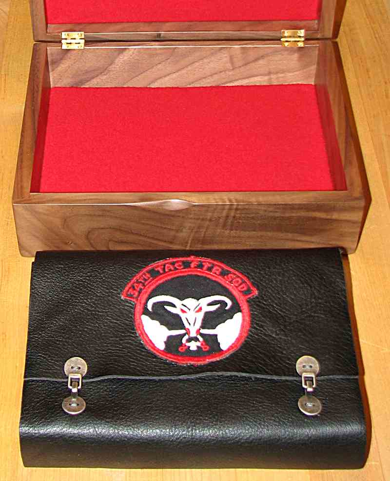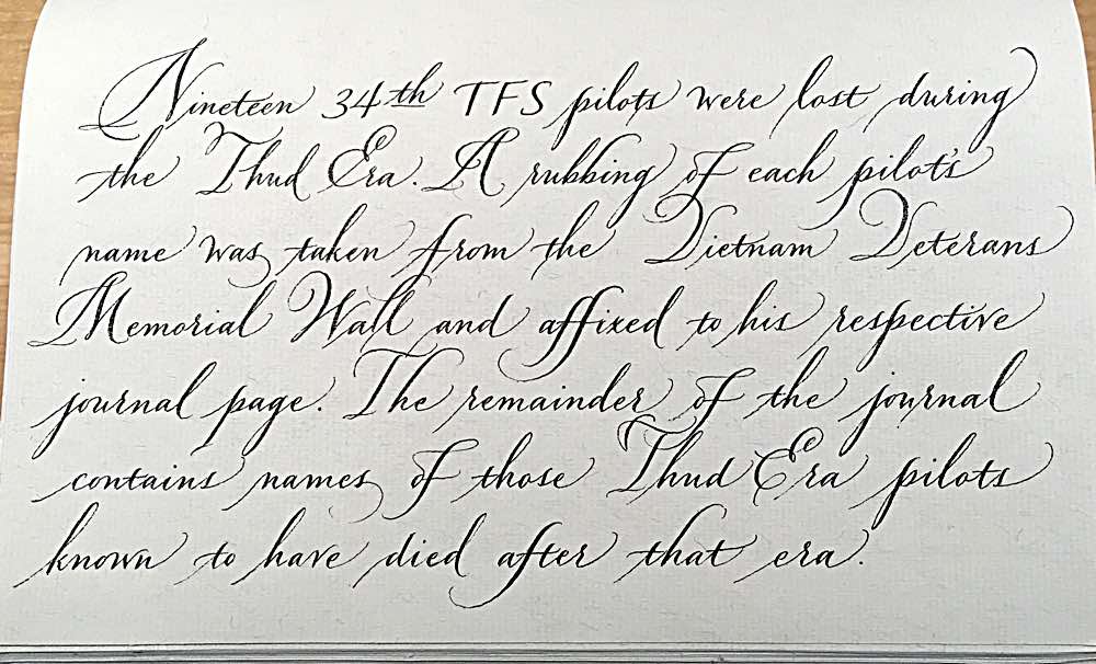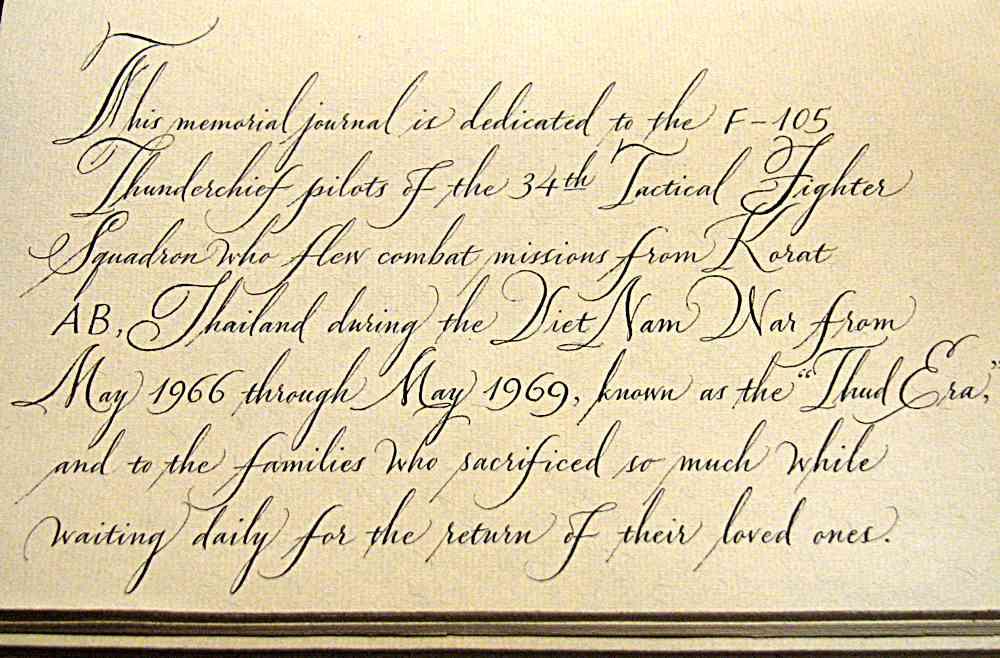This Journal contains the names of known deceased 34th TFS F-105 pilots, starting with those who were lost in 1966 and coming forward to those who have passed away in peacetime. Each is honored with the dignity of a separate page in this hand-made, leather-bound, field journal beautifully crafted by an amazingly talented calligrapher. Both the journal and the custom-made walnut case that protects it are a fitting tribute to these warriors.